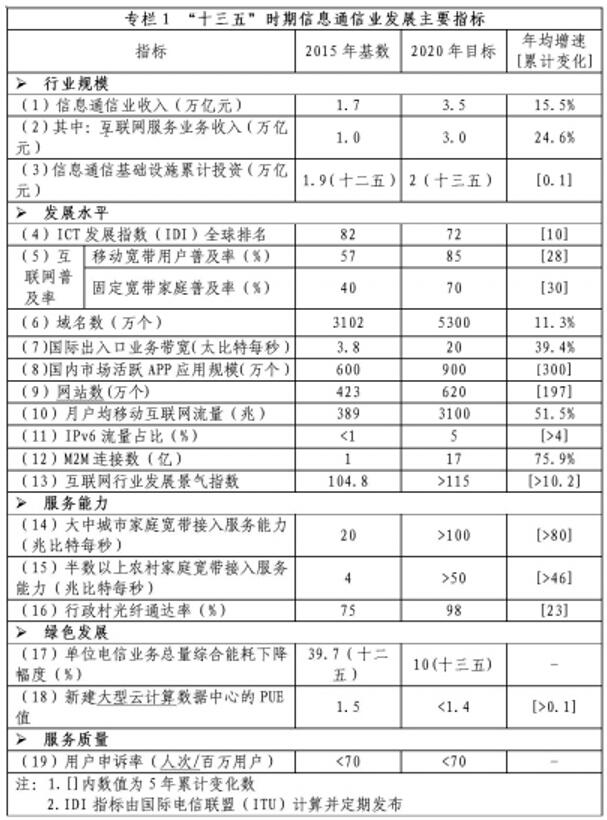 信息通信業(yè)整體規(guī)模進一步壯大,到2020年,綜合發(fā)展水平大幅提升,“寬帶中國”戰(zhàn)略各項目標全面實現(xiàn),基本建成高速、移動、安全、泛在的新一代信息基礎設施,初步形成網(wǎng)絡化、智能化、服務化、協(xié)同化的現(xiàn)代互聯(lián)網(wǎng)產(chǎn)業(yè)體系,自主創(chuàng)新能力顯著增強,新興業(yè)態(tài)和融合應用蓬勃發(fā)展,提速降費取得實效,信息通信業(yè)支撐經(jīng)濟社會發(fā)展的能力全面提升,在推動經(jīng)濟提質(zhì)增效和社會進步中的作用更為突出,為建設網(wǎng)絡強國奠定堅實基礎。