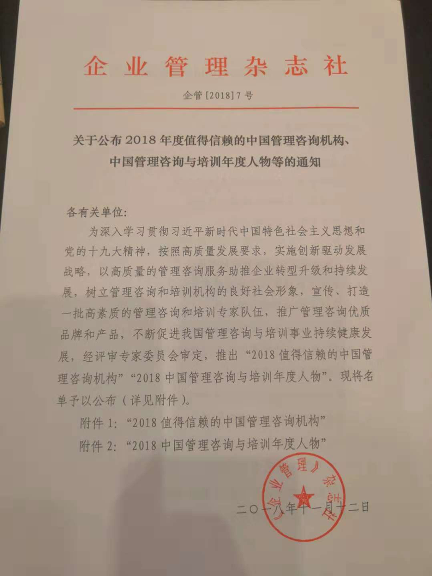 作為行業(yè)的領軍企業(yè),漢哲咨詢再次入選“全國企業(yè)管理咨詢機構推薦名錄”,并榮獲“最受信賴的中國管理咨詢機構”,“中國管理咨詢機構50大”榮譽稱號。