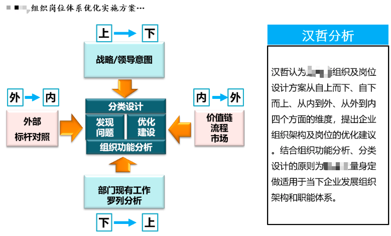 通過戰(zhàn)略方向、外部標(biāo)桿、核心價(jià)值鏈、APQC流程框架、部門現(xiàn)有工作等維度進(jìn)行分析研究,結(jié)合企業(yè)當(dāng)前發(fā)展階段的實(shí)際情況,項(xiàng)目組提出組織崗位優(yōu)化建議。