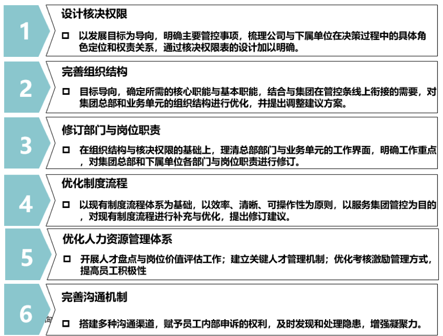 2、組織架構(gòu)變化之后,集團(tuán)總部對下屬業(yè)務(wù)單元的管控定位和管控權(quán)限尚不明確,對下屬單位各條線的管理缺乏具體的工作指引;