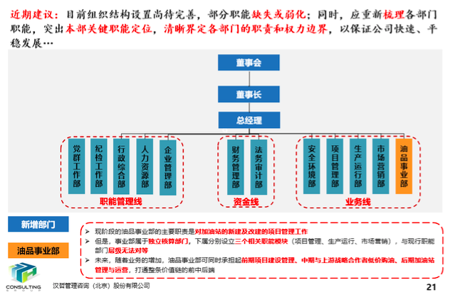 經(jīng)過前期了解,公司內(nèi)部進(jìn)行了多次的組織架構(gòu)調(diào)整,由原來的5個部門調(diào)整為11個部門,并下設(shè)22家分子公司及加氣站,各部門之間的職責(zé)分工及業(yè)務(wù)管理體系存在劃分不清、交叉、弱化等現(xiàn)象,通過對標(biāo)分析相同行業(yè)企業(yè)的組織架構(gòu)情況進(jìn)一步認(rèn)證設(shè)置11個部門是否足以支撐公司業(yè)務(wù)的未來發(fā)展。