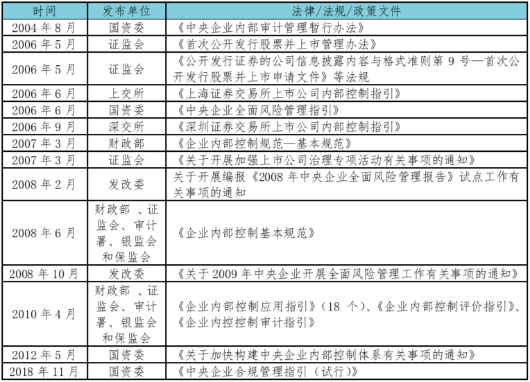 在國家相關(guān)部委發(fā)布的諸多文件中,最為廣泛引用的則是2008年發(fā)布的《企業(yè)內(nèi)部控制基本規(guī)范》,以及2010年在《關(guān)于印發(fā)企業(yè)內(nèi)部控制配套指引的通知》中發(fā)布的《內(nèi)部控制應(yīng)用指引》、《企業(yè)內(nèi)部控制評價指引》以及《企業(yè)內(nèi)部控制審計指引》。
