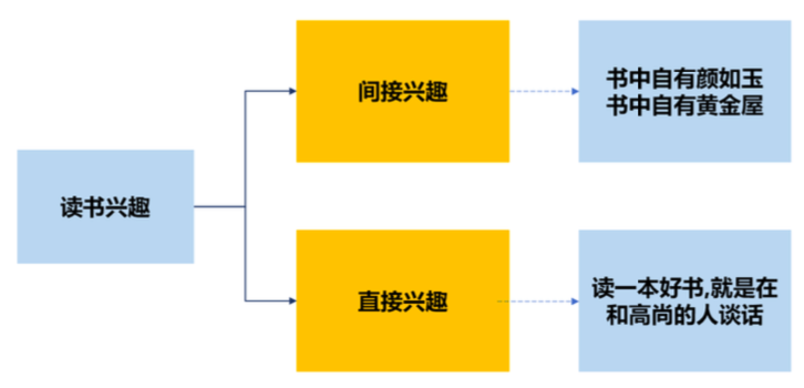 間接興趣是相對(duì)于直接興趣而言的。簡而言之,間接興趣是對(duì)結(jié)果的興趣,直接興趣是對(duì)過程的興趣。打個(gè)比方,爸爸和孩子在海灘邊玩泥巴,兩個(gè)人都很開心。小孩開心,是因?yàn)閷?duì)在泥巴的搓捏和變形過程中感受到的探索和控制的快感。爸爸開心,是因?yàn)樾『⑼娴暮荛_心他也很開心。小孩的這種開心就是純粹的直接興趣,爸爸的這種開心就是間接興趣。同樣,如圖1所示,同樣是喜歡讀書,讀書的直接興趣和間接興趣差異也很大。