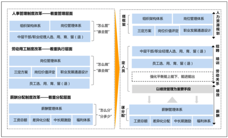 通過(guò)人力資源管理的六大模塊,我們將三項(xiàng)制度改革的相關(guān)內(nèi)容進(jìn)行解構(gòu),以人力資源管理的邏輯對(duì)三項(xiàng)制度改革進(jìn)行二次解讀,使三項(xiàng)制度改革的邏輯更加清晰。
