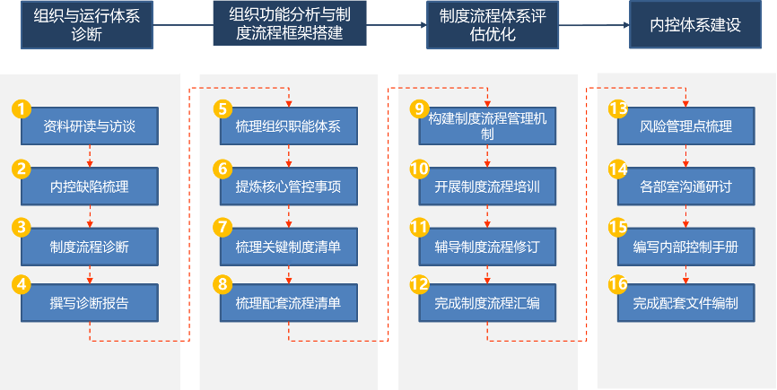 制度及內(nèi)控體系建設(shè)工作按照4個階段16個步驟開展,如下圖所示: