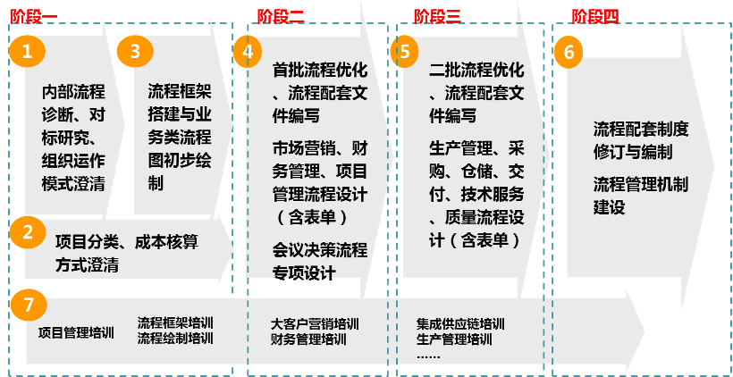 配套培訓(xùn):步驟7培訓(xùn)貫穿于整個(gè)流程設(shè)計(jì)周期,如第一階段的項(xiàng)目管理培訓(xùn)、流程框架培訓(xùn)、流程繪制培訓(xùn),第二階段的大客戶營銷培訓(xùn)、財(cái)務(wù)管理培訓(xùn),第三階段的集成供應(yīng)鏈培訓(xùn)、生產(chǎn)管理培訓(xùn)等內(nèi)容,通過相關(guān)培訓(xùn)開拓思維,統(tǒng)一思想,傳授方法。