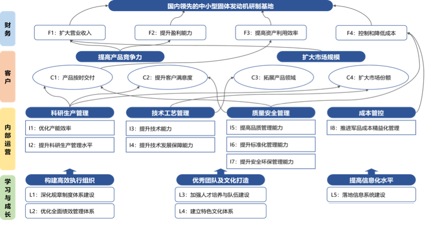 研究所制定《十四五發(fā)展規(guī)劃》,明確發(fā)展目標(biāo)和重點方向,保障戰(zhàn)略目標(biāo)的有效執(zhí)行是重點,根據(jù)研究所的總體戰(zhàn)略目標(biāo),借助平衡計分卡,從財務(wù)、客戶、內(nèi)部運營、學(xué)習(xí)與成長四個方面對戰(zhàn)略目標(biāo)進行逐層分解,形成若干戰(zhàn)略主題,通過各部門梳理和討論,最終確定研究所戰(zhàn)略地圖。