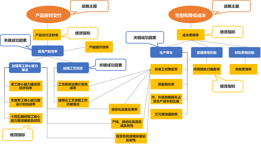 從戰(zhàn)略目標(biāo)出發(fā),層層梳理戰(zhàn)略主題、關(guān)鍵成功因素與指標(biāo)的邏輯關(guān)系,同時分析指標(biāo)間相互影響關(guān)系,進一步識別影響戰(zhàn)略目標(biāo)的核心績效指標(biāo)。通過繪制樹狀的指標(biāo)關(guān)系圖,明確各個指標(biāo)與戰(zhàn)略的相關(guān)性,以此判斷指標(biāo)的戰(zhàn)略重要性,并根據(jù)指標(biāo)與其他指標(biāo)的關(guān)系判斷該指標(biāo)的影響范圍,幫助管理者定位需關(guān)注的關(guān)鍵領(lǐng)域。通過指標(biāo)關(guān)系圖可明確指標(biāo)的戰(zhàn)略重要性及影響度,以此為參考篩選核心指標(biāo)。
