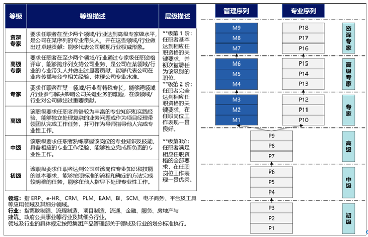 在序列劃分基本確定后,就需要考慮另外一個問題,即單個序列內(nèi)層級如何劃分。隨著越來越多的企業(yè)開始設計職級體系,筆者建議層級的劃分應對標市場主流經(jīng)驗進行設計,即職級體系應與用人市場進行接軌,這樣更有利于未來的外部人才篩選和內(nèi)部人才評價。通過對公開資料進行研讀,筆者整理總結(jié)了目前市場中幾家典型企業(yè)的層級劃分經(jīng)驗: