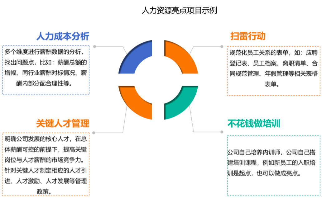 基于人力資源總體目標(biāo),明確未來(lái)五年內(nèi)的關(guān)鍵舉措與重點(diǎn)工作,組織中高層領(lǐng)導(dǎo)召開(kāi)人力資源戰(zhàn)略解碼研討會(huì),將人力資源戰(zhàn)略分解為關(guān)鍵成功因素、具體行動(dòng)計(jì)劃,針對(duì)性的制定人力資源改進(jìn)的關(guān)鍵優(yōu)化舉措,從戰(zhàn)術(shù)層面解決具體問(wèn)題??擅磕暌皂?xiàng)目為載體做亮點(diǎn)工程,圍繞業(yè)務(wù)需求定制亮點(diǎn)工程,根據(jù)項(xiàng)目的運(yùn)作進(jìn)行人力資源管理。