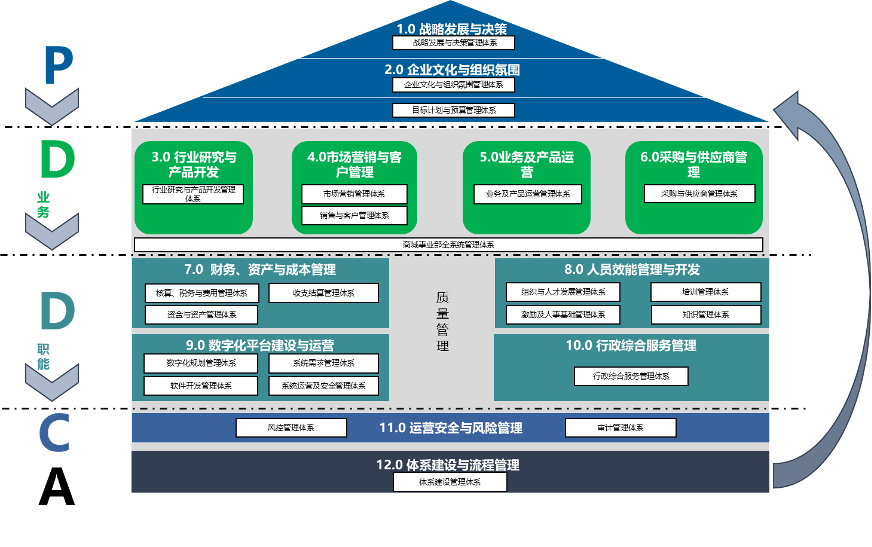 該企業(yè)管理體系梳理思路以“PDCA循環(huán)”理論為依據(jù),建立了體系層面的動態(tài)持續(xù)提升機制。其中,戰(zhàn)略與文化為引領(lǐng),屬于規(guī)劃層;目標計劃預(yù)算活動為銜接;業(yè)務(wù)活動與支持類活動為執(zhí)行層,風控與審計職能模塊為監(jiān)督檢查層,體系建設(shè)與流程管理為改善提升層。體系建設(shè)規(guī)劃以支撐企業(yè)經(jīng)營管理為目標,以持續(xù)提升改善為要求。