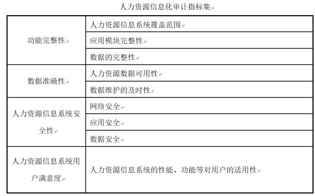 人力資源信息化審計(jì)所關(guān)注的重點(diǎn)是人力資源信息系統(tǒng)如何促進(jìn)企業(yè)運(yùn)營(yíng)管理能力的提升,以及支持企業(yè)發(fā)展戰(zhàn)略的實(shí)現(xiàn)。圍繞以上目標(biāo),我們選擇人力資源功能模塊的完整性、信息數(shù)據(jù)的準(zhǔn)確性、系統(tǒng)的安全性、系統(tǒng)用戶(hù)的滿(mǎn)意度這四項(xiàng)內(nèi)容作為人力資源信息化審計(jì)的重點(diǎn),并設(shè)計(jì)了相應(yīng)的指標(biāo)集,如下表所示: