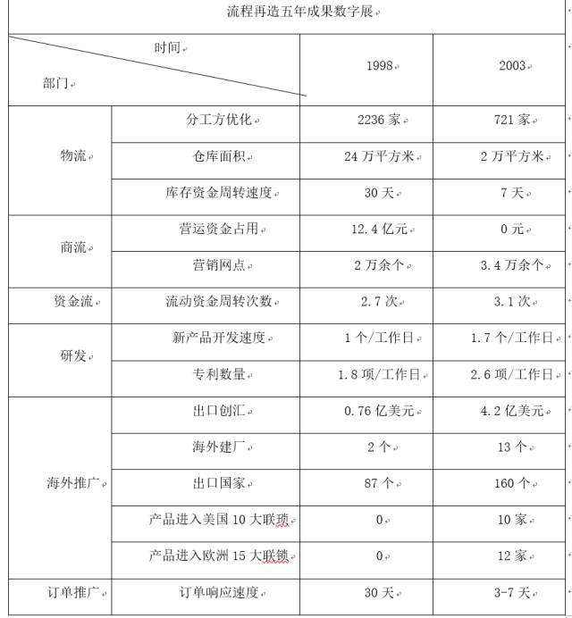 海爾集團(tuán)業(yè)務(wù)流程再造的效果如下表所示。從圖表中可以看到,經(jīng)過流程再造,海爾集團(tuán)在物流、商流、資金流方面都取得了巨大進(jìn)展,在研發(fā)、海外推廣、訂單推廣方面也取得了不菲的成績。