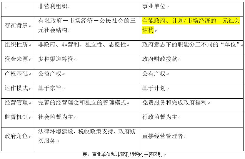 在實踐中,我國在推進事業(yè)單位改革的過程中也逐步提出了非營利組織的概念。試圖參照國外非營利組織的運作機制推動中國事業(yè)單位的改革。要在中國事業(yè)單位改革的過程中引入非營利組織的機制,有必要首先對二者做一個比較。