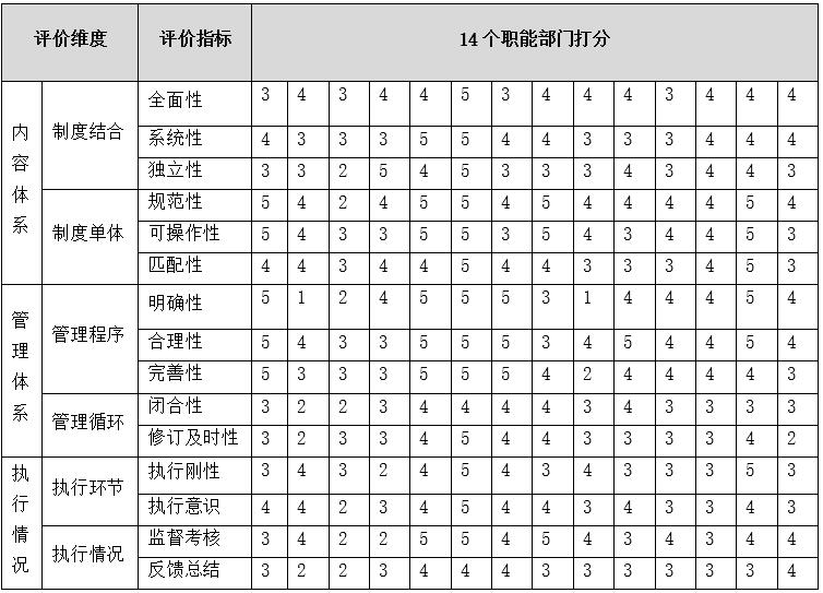 (2) 由綜合管理部牽頭,組織集團(tuán)各職能部門負(fù)責(zé)人,針對(duì)各下屬企業(yè)制度管理情況進(jìn)行評(píng)估和打分。其中,十四個(gè)職能部門,每個(gè)部分派一名領(lǐng)導(dǎo)或代表參與打分,評(píng)分標(biāo)準(zhǔn)按1-5分,從低到高,1分代表最差,5分代表最好。
