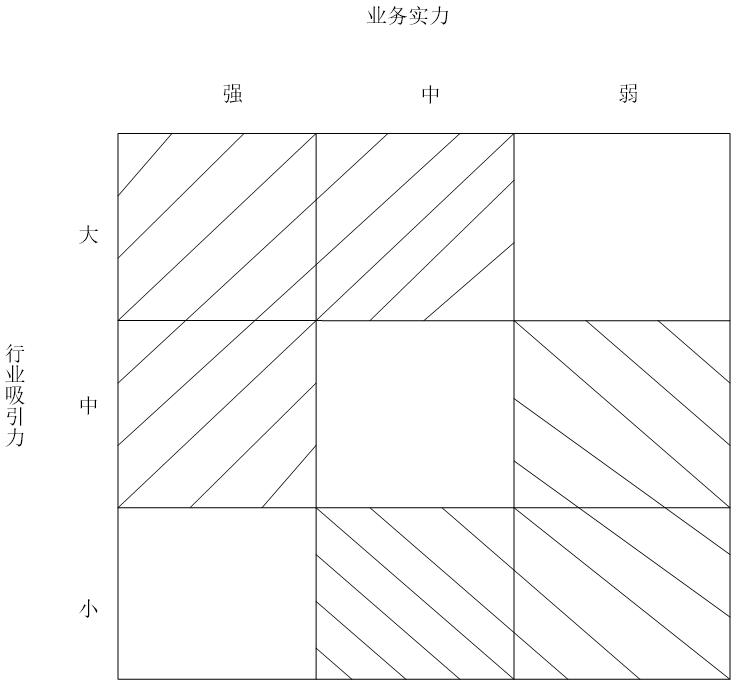 鑒于BCG矩陣的雙因素分析的欠缺,通用電氣公司在自身的業(yè)務(wù)戰(zhàn)略管理實(shí)踐中總結(jié)形成了多因素投資組合評估矩陣(GE矩陣),該方法較BCG矩陣有所改進(jìn),采用“多因素投資組合矩陣”對企業(yè)的戰(zhàn)略經(jīng)營單位加以分類和評價。